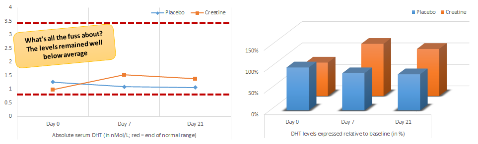 As you will probably already have read in-between the lines, I am not exactly impressed - let alone scared - by these results. Why? Well, the initial 56% increase in DHT was not only followed by a -10% decline during the maintenance phase, but this decline brought the DHT levels of the young men in the creatine group pretty close to where they had been in the placebo group at T0 (1.38nmol/L vs. 1.26 nmol/L for creatine vs. placebo, respectively).