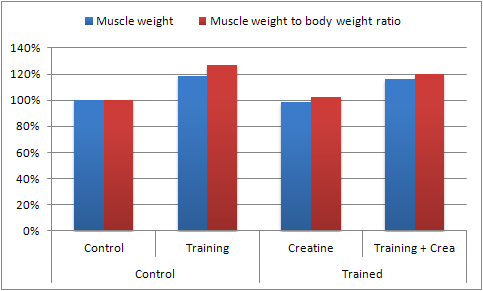 If you add to that that creatine supplementation alone did not have any statistically significant effect on the muscle cross sectional area (figure 1), muscle weight or the muscle weight to body weight ratio (figure 2) Aguir et al. have more than enough evidence to