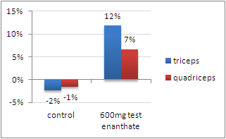 Figure 3: Increase in muscle size in sedentary men on 800mg testosterone enanthate for 10 weeks (Bhasin. 1996)