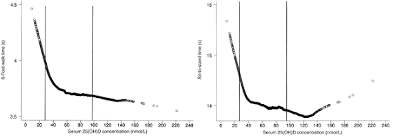 Figure 4: The optimal ranges, Bischoff-Ferrari et al. estimated are based on the above observational data from a 8-foot-walk and sit-to-stand test done in the elderly. That's super reliable and just like you, right? No? Well, that's why I believe those "optimal values" have no relevance for the young and low relevance for the old subjects (Bischoff-Ferrari. 2006)