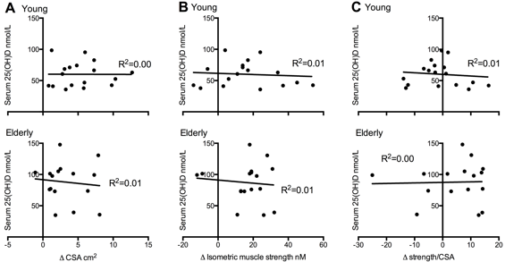In practice, however, the correlation analysis yielded nothing: No correlation between 25OHD and size gains (A), no correlation between 25OHD and strength gains (B), and no correlation between 25OHD and relative strength gains (C). While this does not neglect the possibility that the vitamin D supplement still affected the increase in strength/size ratio of the elderly, the result warrants the conclusion that there was "[n]o additive effect of vitamin-D intake during 12 weeks of resistance training [...] on either whole muscle hypertrophy or muscle strength" (Agergaard. 2015).