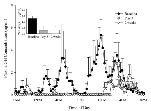 In view of some people's "eat all that cannot run away fast enough" mass gain diets, it is noteworthy that the decline in GH concentration is not an initial reaction. As it is shown in figure 1, GH response stayed way below baseline for the whole 2 weeks the subjects ate their standardized meals containing 70 kcal/kg fat-free mass/d (~4000 kcal/d; 50% carbohydrate, 35% fat, and 15% protein).