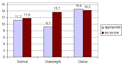 Figure 1: Infant body fat [%] in formerly normal, overweight and obese women with either appropriate of excessive gestational weight gain