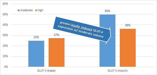 | Figure 2: The overall greater GLUT-4 response to insulin (signifying improvements in insulin sensitivity) probably explains the advantage of the medium volume training (Reichenkendler. 2013) |