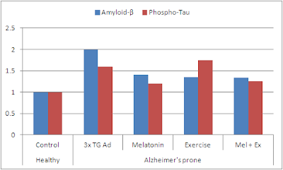 Published in the December issue of Neurobiology of Aging is a paper that investigated the effects of six months of high dose (10mg/kg) melatonin supplementation and/or exercise on six-month-old 3xTg-AD mice. Due to their specific genetic make-up, these mice are prone, or rather destined to develop Alzheimer's at a pretty young age. Based on previous research on the effects of exercise and the anti-oxidative properties of melatonin, the researchers speculated that if each of them could exert beneficial effects on the development of the Alzheimer's-inducing plaque in the brain of the mice, the combination of exercise + melatonin should be even more protective.