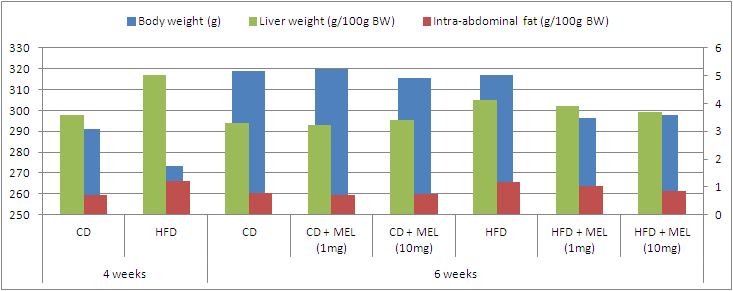 Figure 4: Body weight (left axis) and liver and intra-abdominal fat weight (right axes) after 4 weeks on control or high fructose diet without melatonin and after two additional weeks with daily injection of 1mg/kg or 10mg/kg melatonin (data adapted from Kitagawa. 2012)