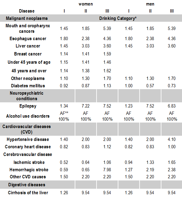 Table 1: Relative Risk for Major Chronic Disease Categories, by Gender and Average Drinking Category (Rehm. 2002)