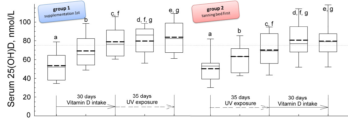 Figure 2: Serum vitamin D (25OHD) levels during the supplementation / tanning bed phase in the two arms of the study (Lagunova. 2013)
