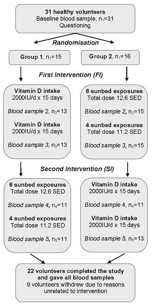 As the graphical outline (see figure 1) of the study protocol goes to show you, the 8 men and 23 women were assigned to two different groups. Both groups underwent both the tanning bed, as well as the vitamin D3 supplement intervention (cross over design) with the only difference being that one group started out taking 2,000IU vitamin D (Carlson's brand), while group II jumped right onto the tanning bed, ...