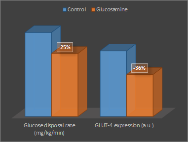 Figure 2: At normal glucose levels (<35%) glucosamine reduces skeletal muscle  GLUT-4 expression and glucose disposal (Baron. 1995),