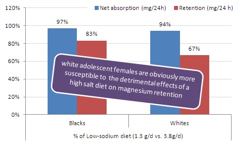 • Figure 4: Relative magnesium absorption and retention in black and white girls (11–15 y old) after 3 weeks on a high sodium diet (3.8 g/d); neither calcium intake nor vitamin D levels influenced the detrimental effects of the high sodium diet (Palacios. 2013)