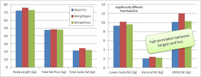 figure 1, left) , as well as their visceral and upper body subcutaneous (UBSQ) fat loss showed statistically significant correlations with the initial weight gain (p < 0.0001, p =0.001, respectively), or as a non-scientist would say it: Only for the aforementioned parameters everything was in fact back to baseline - the lower body fat gains, on the other hand stuck.
