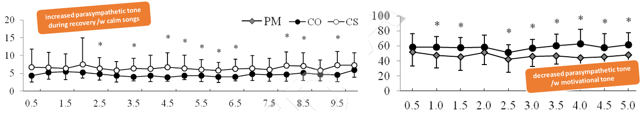 "Repeated measures ANOVA revealed increased respiratory frequency during fast music as compared to the no music and sedative music conditions (p < 0.01). Plasma cortisol levels did not differ at baseline across the music conditions; however, following high intensity exercise, higher cortisol levels were associated with fast music as compared to no music and sedative music (music X intensity interaction, p < 0.01) [...] there was a music x group x intensity interaction (p < 0.05) in which untrained subjects reported more positive affect compared to trained subjects while listening to fast music during low and high intensity exercise. Data collected at voluntary exhaustion revealed significantly more positive affect and higher skin temperature (p values < 0.01) in untrained compared to trained subjects." (my emphases in Brownley. 1995)
