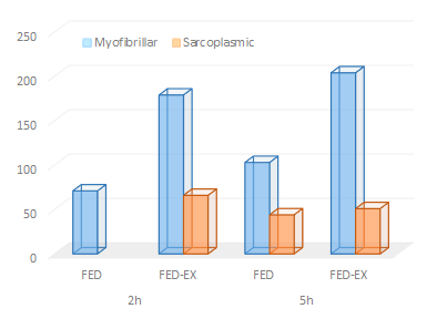 | Change (%) in myofibrillar and sarcoplasmic protein synthesis after ingestion of 25g whey at rest (FED) and resistance exercise (FED-EX) after 3h and 5h (Moore. 2009a) |