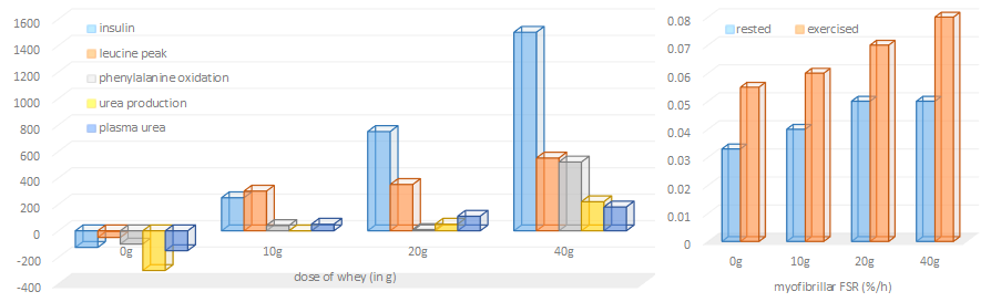 We are talking about statistical significance here: I know what you are going to tell me, now. And yes, you are right. The protein synthesis was in fact higher, but that's more of a matter of how sustained the increase was and not a matter of a "faster" protein synthesis. In other words, with 20g of a fast absorbing whey protein and a whole meal with slow absorbing proteins 30-40min after you will achieve the same - if not higher muscle protein synthesis rates in the long(er) run (>2h)... ah, and by the way: The response in the untrained leg confirms: There is not additional MPS stimulus from 40g vs. 20g of whey (much contrary to the insulin spike, by the way ;-).