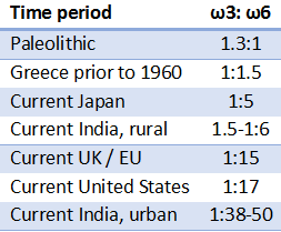 If you have ever wondered about the "evolution" of the omega-3 vs. omega-6 ratio in our (=the human) diet, I suggest you take a closer look at the table to the right. According to this overview from a 2004 paper by Artemsis Simopoulus in Food Reviews International. As you will see, it has more than just reversed ever since the paleolithic era.