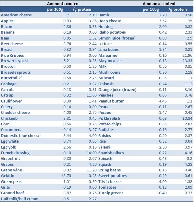 - Rudnan D, Smith RB 3rd, Salam AA, Warren WD, Galambos JT, Wenger J. Ammonia content of food. Am J Clin Nutr. 1973 May;26(5):487-90.