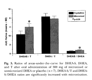 Micronization increased the area-under-the-curve ratios for dehydroepiandrosterone sulfate/dehydroepiandrosterone and dehydroepiandrosterone sulfate/testosterone.Or in other words: A significantly lower amount of DHEA is converted to androgens, upon administration as a micronized preparation (cf. Fig.3 from Casson. 1996, to the left). The inclusion of a lipid matrix, like some companies have it, may further potentate this effect. However, scientifical validation of this hypothesis, especially in the case of DHEA, appears to be lacking. In spite of that, if your goal is to increase DHEA-S, then micronized preparations are to be preferred over crystalline standard formulas. If you want to boost your androgen levels, regardless of possible downstream effects on estrogen (E) and dihydrotestosterone (DHT) you will be better off with the cheaper standard preparations.
