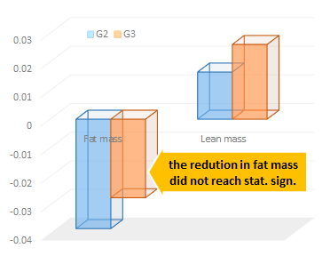 As it was to be expected, neither the total fat mass, nor the fat percentage (measured reliably by DEXA) changed statistically significantly and the bone mineral content, and bone mineral density of the men and women in both groups didn't change at all (previous studies show that vibration training can increase bone density or at least reduce the bone loss in people who are at risk of osteoporosis | de Zepetnek. 2009).