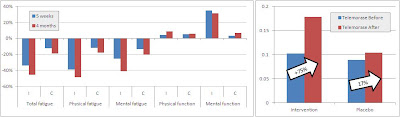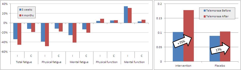 Figure 1: Changes in physical and mental features of chronic fatigue (left) and telomerase length (right) in response to 5 weeks of supervised and 4 months (total) of a twice weekly Qigong program (based on Ho. 2012)