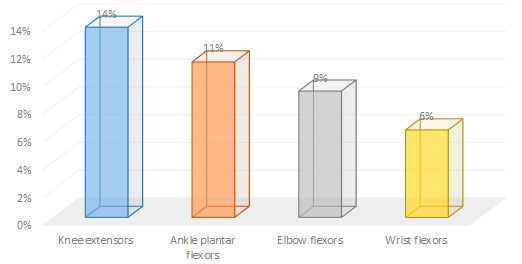 Figure 2: Relative increase in isokinetic peak torque values of the 4 muscle groups for the CAF vs. placebo treatments at an angular velocity of 60°/s (Timmins. 2014)