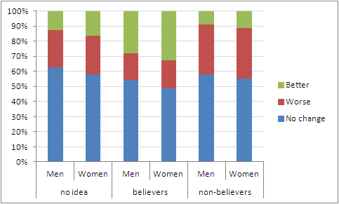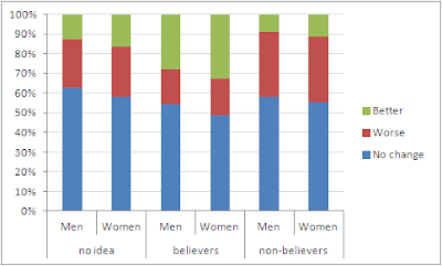 What is strange though, is that of all statistically significant differences between women who believed they received the supplement and those who did not, just this one is the least distinct. Moreover, in all the other variables, where there was a statistically significant difference between believers and non-believers, the "real" data (meaning the comparison of subjects who actually received the treatment vs. the placebo group) could not confirm the positive self-assessment of the believers. Among the male subjects, there was even a trend toward reduced quality of life measures in the real data, where the "believers" thought that it was the "supplement" they were taking that soothed their bodily pain, improved their general health or overall physical performance (physical summary scale).