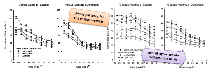- training with resistance bands elicited higher EMG activity in knee and hip extensor muscles (vastus lateralis, vastus medialis, rectus femoris, gluteus maximus) and during the more flexed knee joint positions (i.e., in the reversal phase)