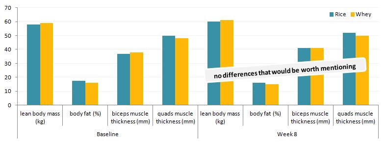 Overall, the study at hand does therefore provide reliable evidence that people with dairy intolerance fair pretty well with a rice protein - as long as they make up for the 30% lower leucine content."In the present study, the combined muscle thickness of the VI and VL increased in both the rice protein (0.2 cm) and whey protein (0.5 cm) conditions. Lean body mass increased in the rice protein condition by 2.5 kg, and it also increased in the whey protein condition by 3.2 kg. Combined bench press and leg press 1-RM strength increased in the rice protein condition by 76.4 kg and in the whey protein condition by 89.5 kg. However, no significant differences were observed between the two conditions for any measure. The collective findings of our study and others suggests that as the amount of protein consumed increases, the importance of the relative leucine content of the protein diminishes" (see figure 4; Joy. 2013).
