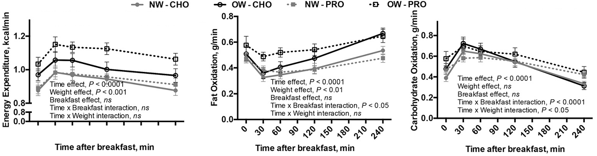 The results were unambiguous: After breakfast, OW children in the PRO group had higher (P < 0.0001) EEs and fat oxidation over the 4 h period than did the NW children in the CHO and PRO groups. Of these, the increase in energy expenditure was transient and didn't last for the full 4h period. The increase in fat oxidation in response to the high protein intake, on the other hand, lasted for the full 4 h period (+16%; P < 0.05) and went hand in hand with a surprisingly pronounced 32% increase in carbohydrate oxidation in the PRO vs. CHO (P < 0.01) trial.