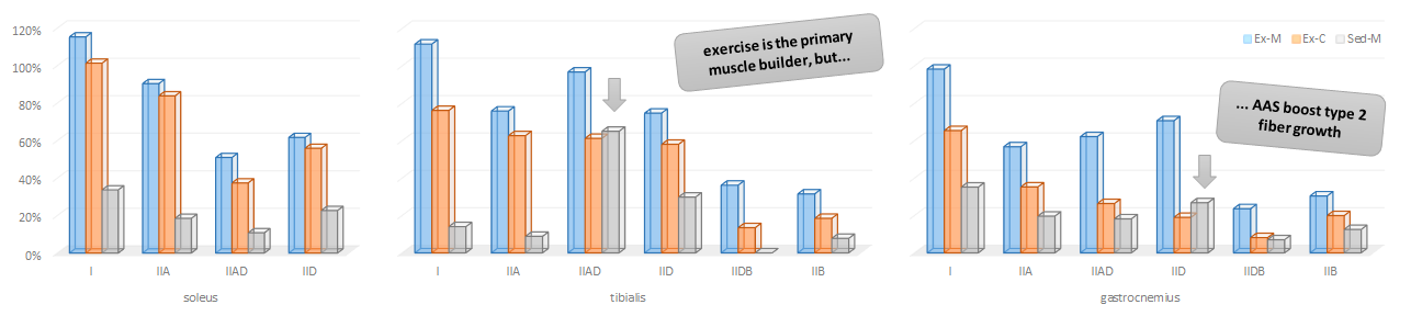 If you take a closer look at the detailed fiber type analysis the researchers conducted (Figure 2), you will see that a similar trend can be observed in the "intermediate" muscle, the gastrocnemius (see grey arrow). The effects the DHT clone had on the "oxidative" soleus, on the other hand, were in no instance more pronounced than those of the 20-60min treadmill running regimen (see Table 1, for details).