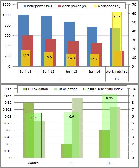 When Laura J. Whyte and her colleagues compared the effects of the single bout of very high-intensity exercise (SIT: 4x 30-s maximal sprints w/ 4.5min recovery between each) to a single maximal extended sprint (ES) matched with SIT for work done, they found that the immediate advantage of higher insulin sensitivity (measured via oral glucose tolerance test) in the work-matched continuous sprint the shorter duration 190s (TOTAL!) as well as almost identical...