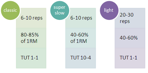 • SS: 6-10 reps, super-slow (10s) concentric (no typo!) and slow (4s) eccentric TUT, 40-60% of the individual 1-RM