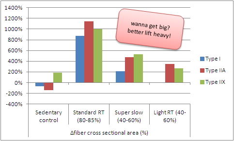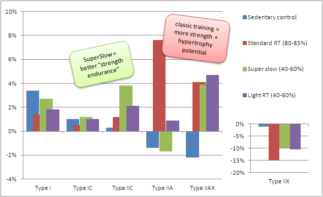 What's still missing though is the effect on overall body composition, where the super slow regimen did in fact produce almost identical results, while the "pump" workout ... ah, I mean the "strength endurance workout" sucked here just as it did as far as its effect on the increase in growth the number of hypertrophy-prone type II fibers is concerned.