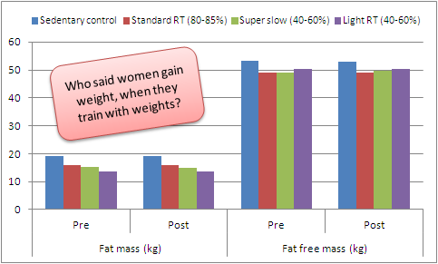 Apropos diet, while the subjects did not have to log their calorie let alone macronutrient intake, I would bet that with a simple protein shake after their training and some general tweaks to their diets, those favorable changes in body composition, i.e. decreases in fat and increases in lean mass, which are at the heart of "looking good naked" would have come about... with the "I love my pasta and red-meat gives you cancer"-diet from the latest cosmopolitan, on the other hand, you better stick to baggy jeans and huge sweaters instead of bikinis and speedos, ladies and gentlemen ;-)