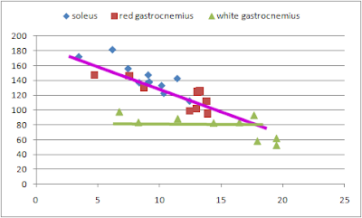 always be linearly dependent on intra-muscular creatine stores. While this seems to be the case for the red, oxidative muscle fibers (violet regression in figure 3), the fast-twitch white glycolytic fibers appear to react assimilate creatine at a constant rate (green regression in figure 3) up to a certain threshold (in Brault's rat study that was ~17µmol/g, which is about +30% more than the maximal creatine content measured in red fibers in the same study), at the creatine uptake suddenly drops (cf. figure 3). What is even more confusing, though is that the insignificant changes in the creatine transporter protein expression measured by the scientists reflect neither the linear decrease nor the constant uptake rates. As Brault et al. point out "