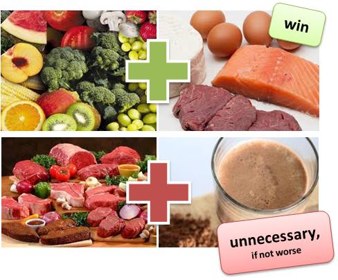 | Figure 3: The principle of relativity for protein based body recompositioning diets - When it comes to weight los, the word "high" in high protein diets must always be seen in the context of habitual protein intake and to whom we are comparing our dieters; or put simply: The average SAD dieter benefits from every gram, the average bodybuilder will hardly benefit from the 7th whey shake. |