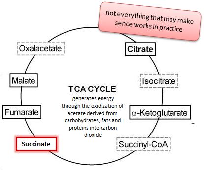 | Figure 4: In view of the fact that the TCA or citric acid cycle is one of the #1 aerobic source of cellular energy (APT) and succinate is one of its intermediates it makes sense that supplementation could improve exercise performance, but hitherto this has not been confirmed. |