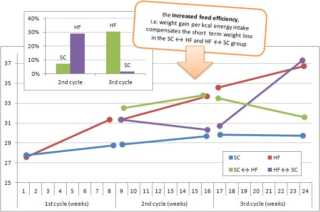 | Figure 1: Despite intermediate fat loss the increased feed efficiency (=weight gain per kcal) that is especially pronounced in the HF phases of the weight cycling groups quashed the previous weight loss. If age effects had not become a problem this effect would have been more obvious in a 4th cycle. |