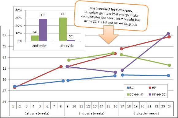 figure 2, right), would have been similar or even more pronounced after 32 weeks and 4 cycles in the then HF dieting SC ↔ HF (note: one of the reasons the researchers did extend the experiment for another 4 weeks was that even now, age-related effects and obesity related morbidities would have reduced the significance of the data).