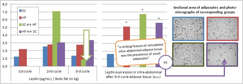 figure 2, left, 3rd cycle). Thus, the drop in leptin levels upon "fasting" in the (SC ↔ HF, 2nd cycle and HF ↔ SC, 3nd cycle) is systemic, but does