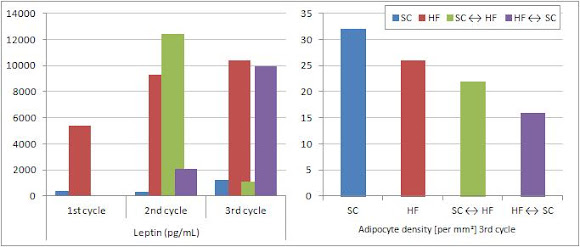 And what is interesting is that in this calorically non-restricted scenario, the respective "relative leptin deficiency" occurs only in the SC ↔ HF group during the third and last cycle, when their relative leptin levels which should actually be identical to the SC group (we must compare them to the SC group, because the current diet will influence leptin expression as well) are 36% lower than they "should" be. In the same third cycle, the HF ↔ SC group (remember, those are our "formerly obese kids") have 21% more leptin in their blood than they "should" - given their current adipose tissue mass.