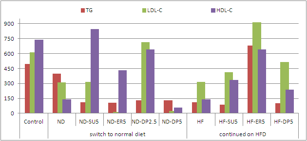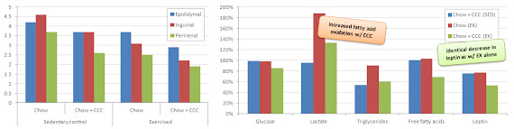 | Figure 1: Fat pad weight (in g) and serum glucose, lactate, triglycerides, free fatty acids and leptin levels expressed relative to sedentary rodents on standard chow (Hongu. 2000) |