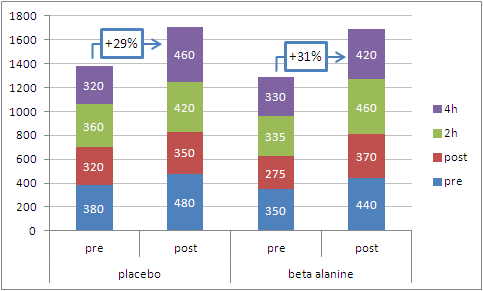 some sort of a "likely harmful" rebound 6h after the 40 min exercise bout. Before you do now flush your beta alanine stores down the toilette, I suggest you first take a look at the actual (absolute) effects beta alanine supplementation had on the exercise induced changes in GSH levels: