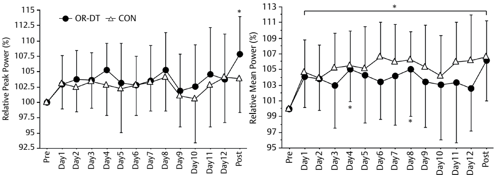 | Figure 2: Relative peak power and mean power during the pre- and post-test days as well as on the differently timed training days in the OR-DT and CON group (Hasegawa. 2015). |