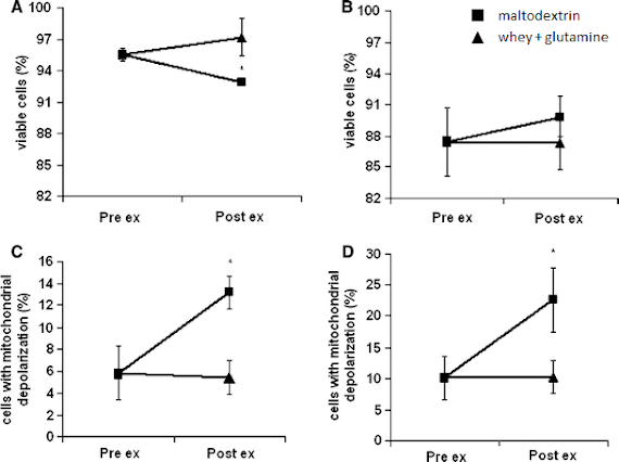 | Figure 7: Effect of maltodextrin (filled square) and maltodextrin plus hydrolyzed whey protein enriched with glutamine dipeptide (filled triangle) supplementation on exercise-induced loss of membrane integrity and depolarized mitochondria in lymphocytes and neutrophils, which are essential for the response against viral infections, such as upper respiratory tract infections (URTI), in athletes after intense training (Cury-Boaventura. 2008). |