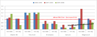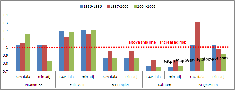 | Figure 2: Raw data and minimally adjusted (age and caloric intake) data on the effect of taking vitamin B6, folic acid, B-complex, calcium, and magnesium on overall mortality (data calculated based on Mursu. 2011) |