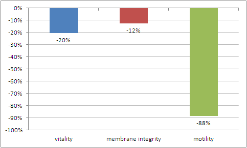 Figure 1: Reductions in vitality, membrane integrity and mobility of previously healthy (elite ;-) sperm after 60-min exposure to cell-phone radiation (data adapted from Dkhil. 2011)
