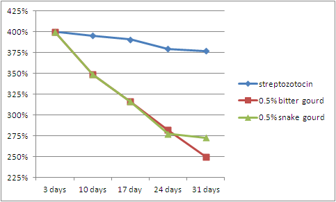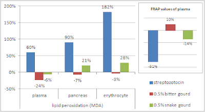 And while the glucose levels were still 150% above those of the healthy control levels, the streptozotocin-induced lipid peroxidation in plasma, pancreas and erythrocytes of the lab animals was ameliorated by the snake gourd oil treatment (remember that is the stuff from pomegranate) and even reversed by the bitter gourd diet. Judged by the standardized FRAP assay, the "diabetic animals" that were fed a diet that contained 0.1% alpha-eleostearic acid (of the total diet, which had 20% fat) even exhibited a 10% greater total antioxidant capacity than the totally healthy control!