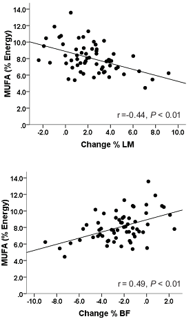 When expressed as a percent of total energy, dietary fat composition was correlated with changes in anthropometrics. Reported MUFA at 12 wk was inversely and positively associated with changes in % LM and % BF, respectively.