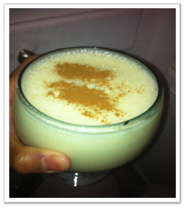 After blending the eggs till frothy, add all the other ingredients and blend till frothy, and you can add a couple more sprinkles of cinnamon on top to make your drink look fancy. ;-)
